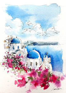 1. 以油性針筆勾畫風景線條,再以水彩為旅途填上色彩。